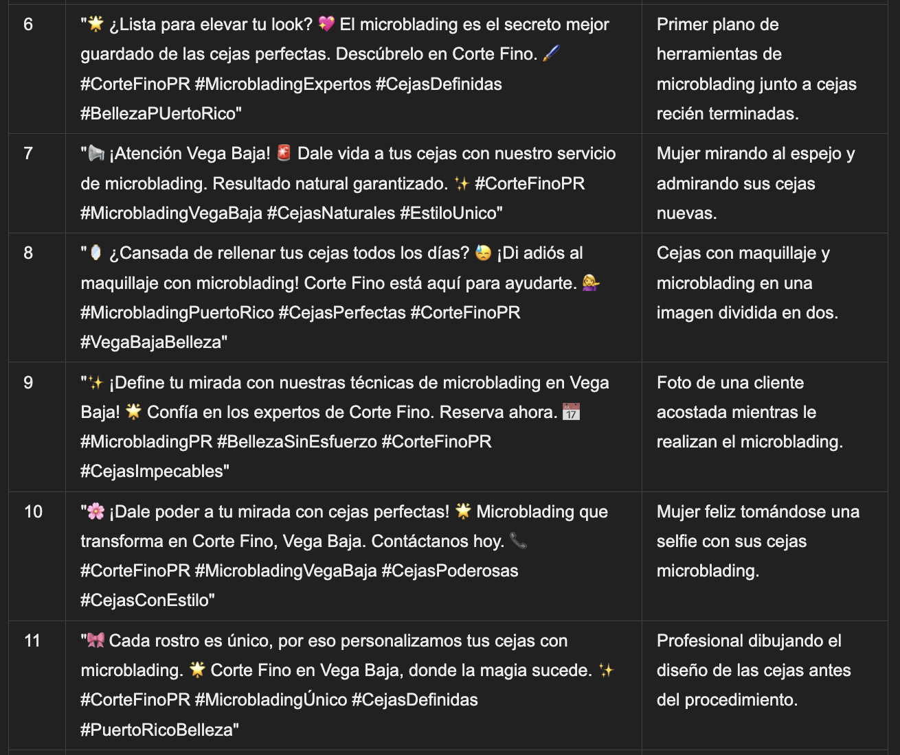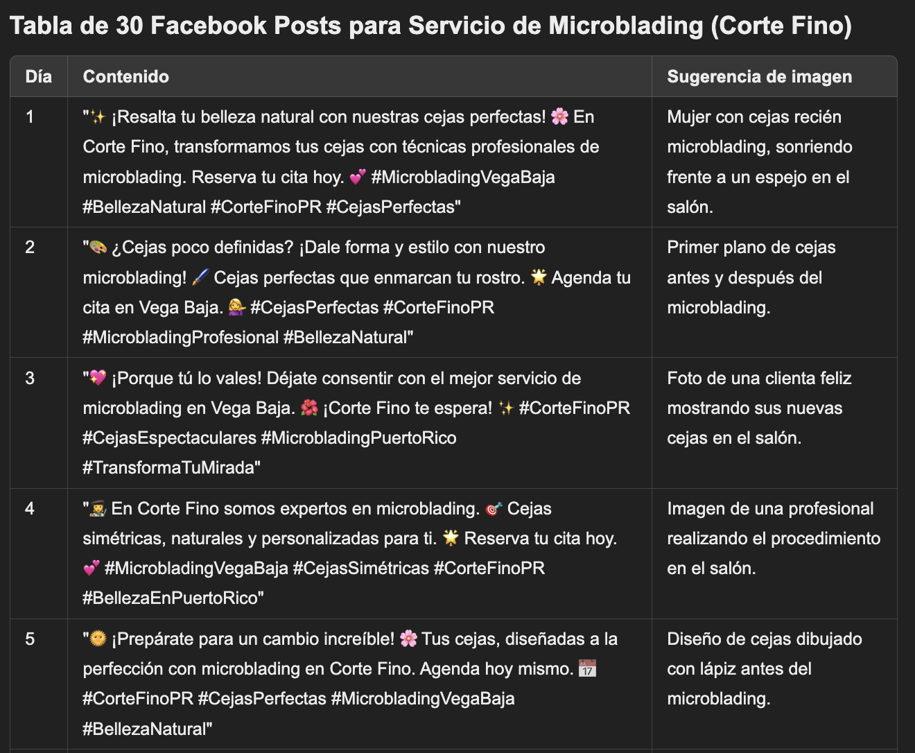 ¡Transforma tu presencia en redes sociales con 30 posts únicos y cautivadores! Utiliza la inteligencia artificial de ChatGPT para crear contenido relevante y atractivo para tu med spa, PMU, microblading o salón de belleza. Atrae a tus clientes con publicaciones que resalten tus servicios y promociones. ¡Eleva tu presencia digital hoy mismo con nuestra ayuda!