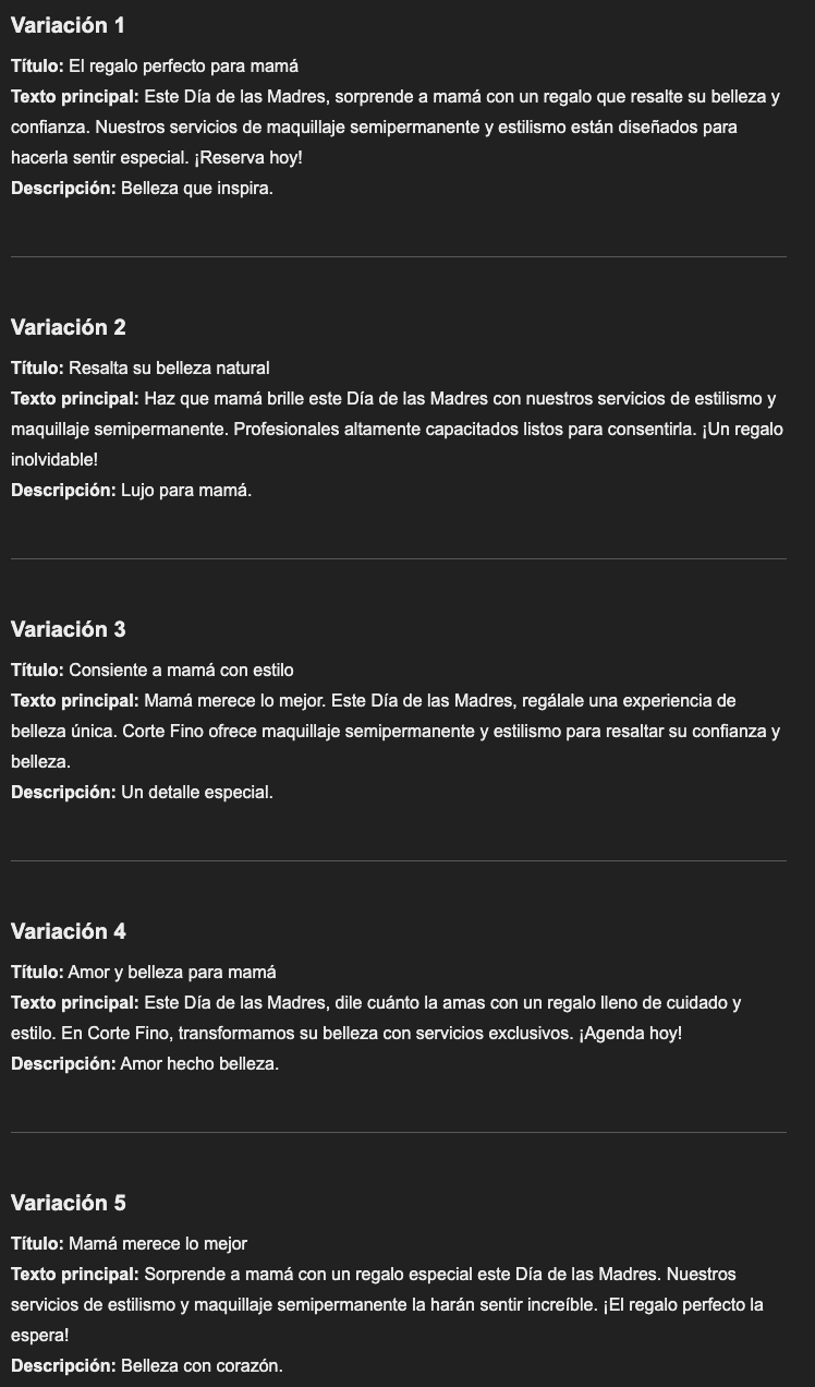 Eres un experto en anuncios de Facebook. Corte Fino vende Servicios de belleza como Maquillaje Semipermanente y Estilismo que hacen resaltar la belleza y confianza de la mujer por expertos y profesionales altamente capacitados. Estoy ejecutando una promoción para el Día de Las Madres dirigida a personas que quieren regalarle a esa madre especial. El tono de mi marca es romántico, tierno, cálido. Genera 5 variaciones de texto para anuncios de Facebook para mi público objetivo utilizando esta plantilla de texto: Título (máximo 40 caracteres), Texto principal (125-300 caracteres), Descripción (máximo 30 caracteres).